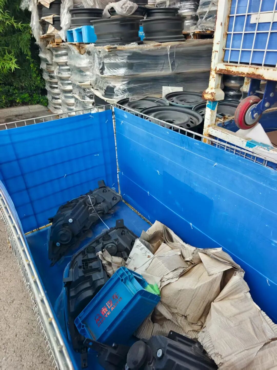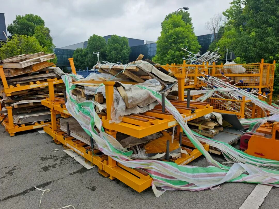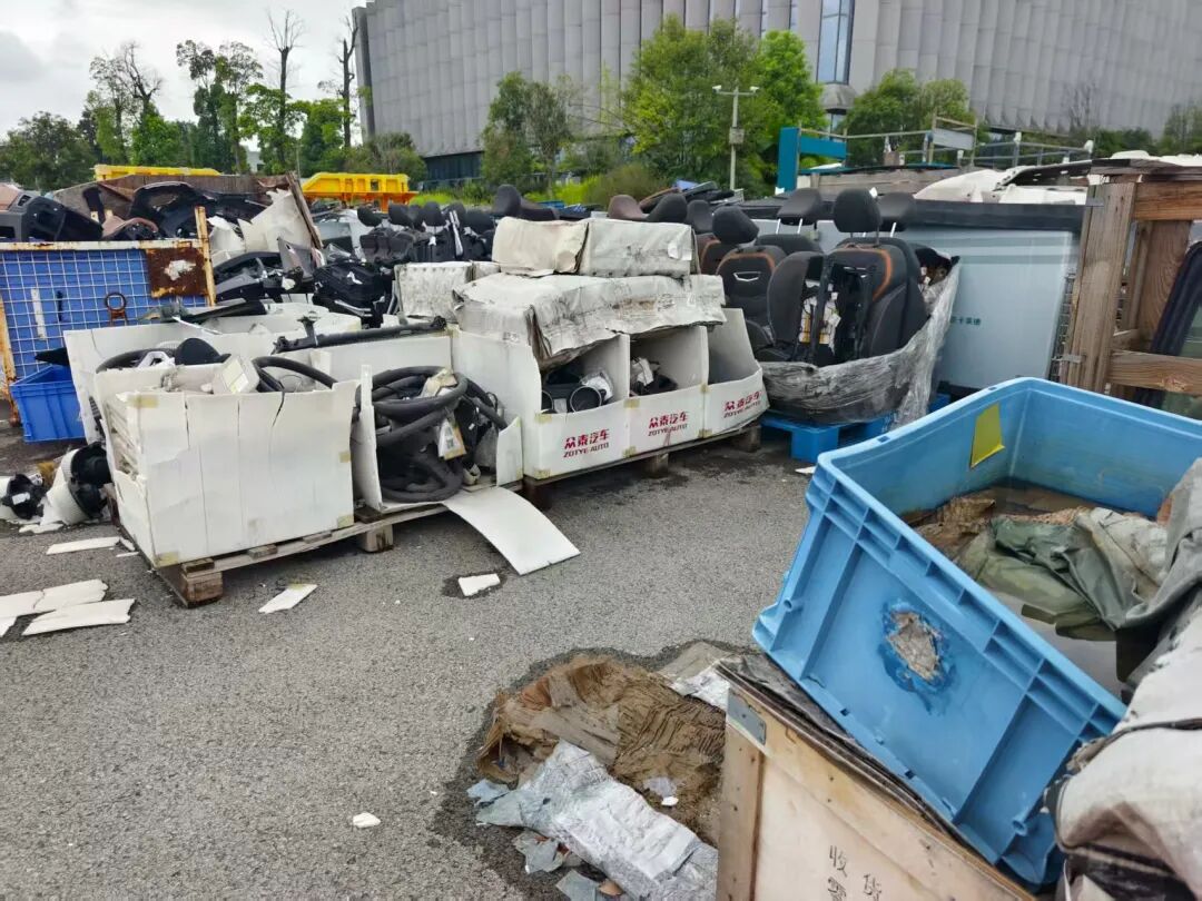 厂房后的绿化带旁,两处空地成为零部件的露天堆场。还没有来得及被使用就被随意堆放的零部件被堆成一个个垛头,像是一个零部件的坟场。