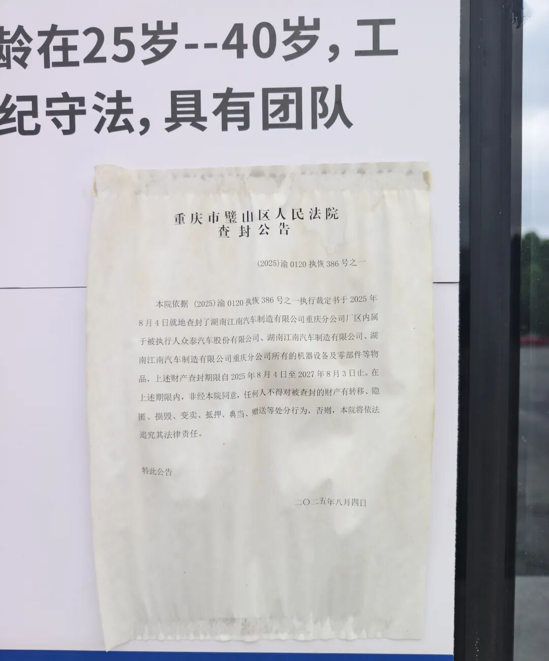 查封公告显示,依据(2025)渝0120执恢 386号之一执行裁定书,于2025年8月4日就地查封了湖南江南汽车制造有限公司重庆分公司厂区内属于被执行人众泰汽车股份有限公司、湖南江南汽车制造有限公司、湖南江南汽车制造有限公司重庆分公司所有的机器设备及零部件等物品,上述财产查封期限自2025年8月4日至2027年8月3日止。