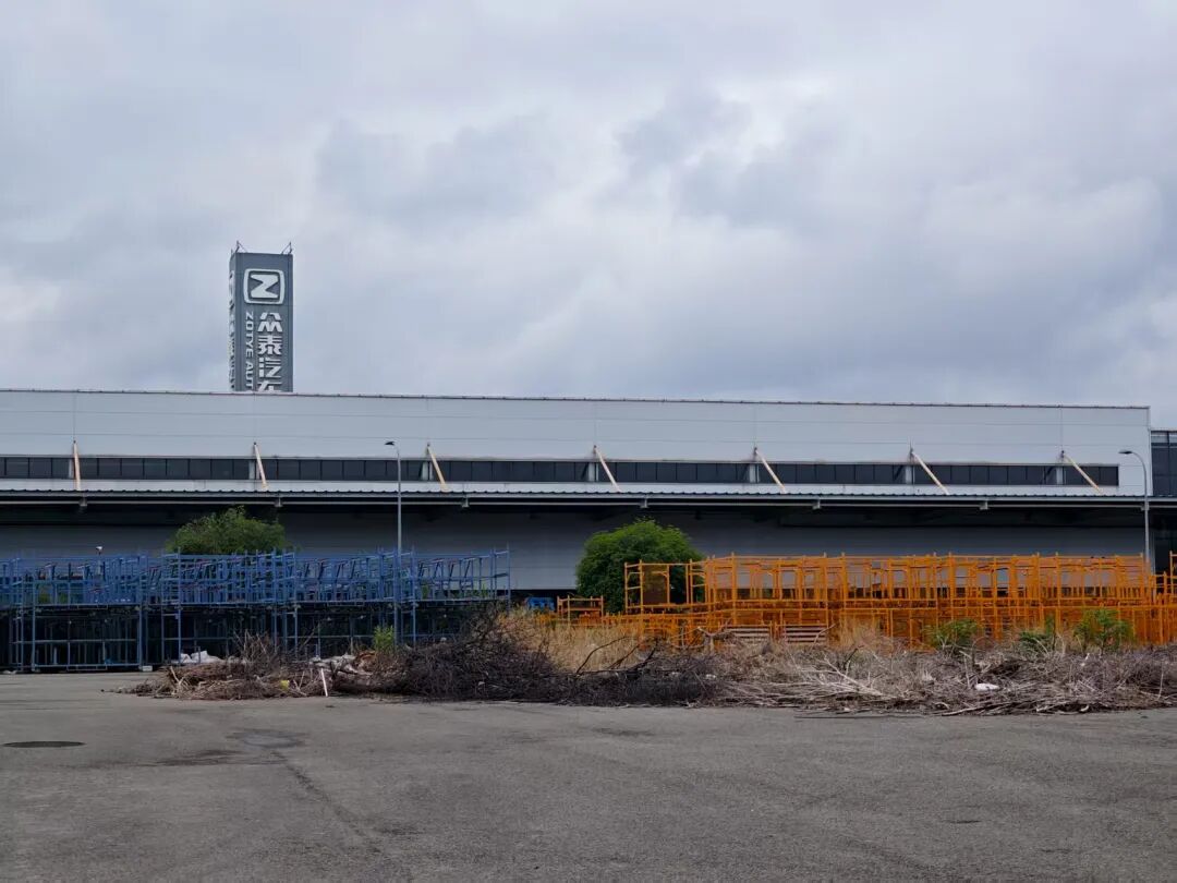 厂区的入口处可以远远望见高高耸立的“众泰汽车”精神堡垒,近处则是一片枯树枝与杂草丛生的空地,空地和精神堡垒之间是一排厂房,厂房门口摆着大量蓝色和橙色的铁架子。