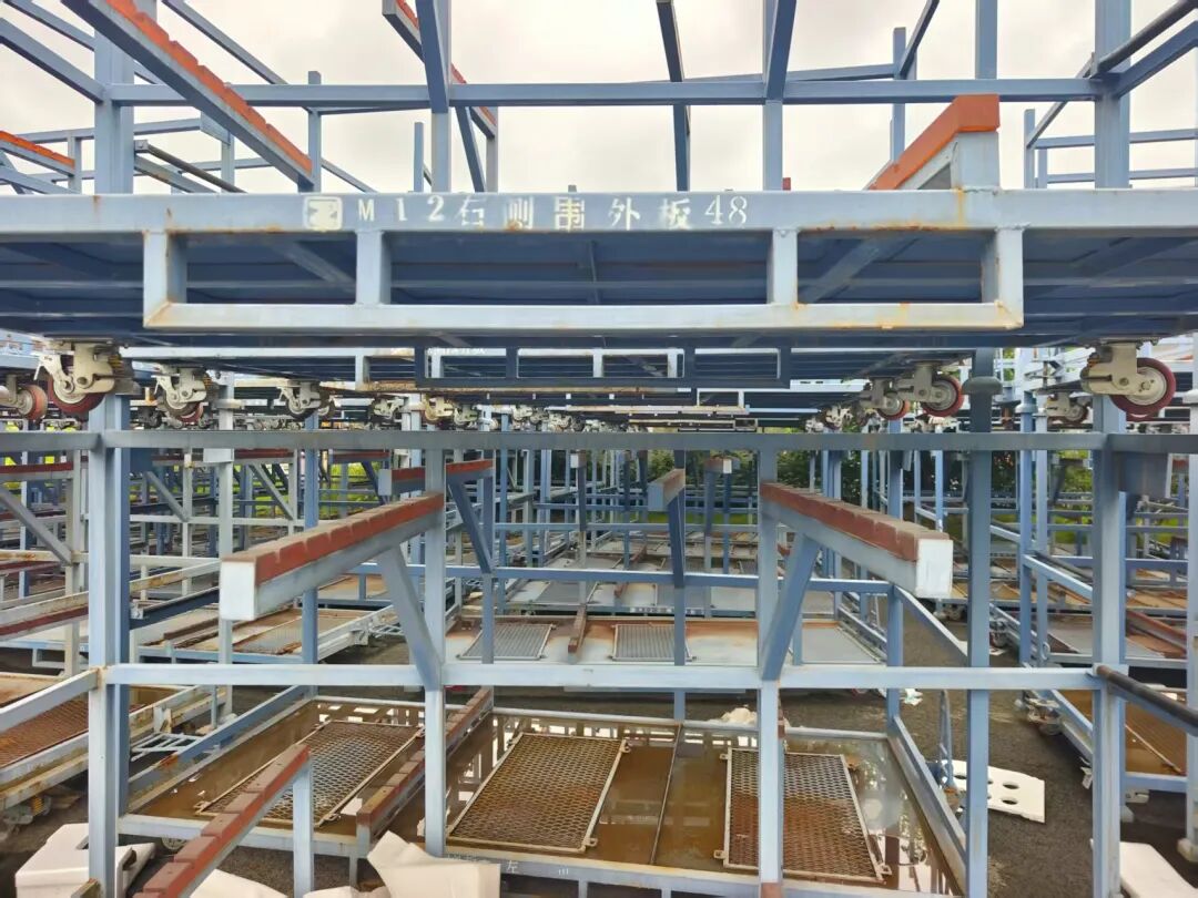 橙色的架子上印着“流水槽焊接总成”“后围板总成”“前围板加强横梁总成”“右前纵梁内板分总成”。蓝色的架子下方,铁盘兜着雨水,局部已经开始生锈,架子上印有众泰汽车的LOGO,标识着“M12右侧围板48”“右后门外板66”等字样。一些白色的架子上还有供货商的信息,显示供货商是延锋安道拓江津分公司,零部件名称为“后座椅总成(后大座/4分背/6分背)”“前座椅总成(左/右)”等。但这些都是已经被拆空,上面没有零部件。
