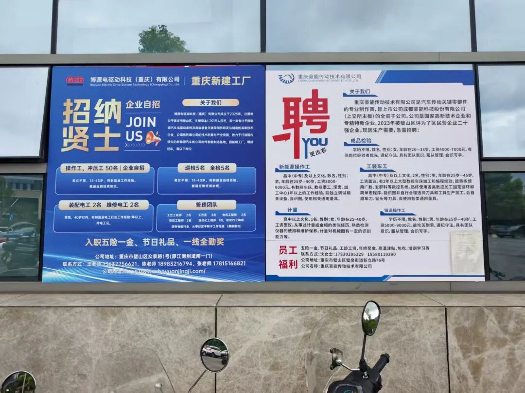 厂区大门前,两张崭新的招聘广告在雨中格外醒目。博源电驱动科技和重庆豪能传动技术,这两家与新能源汽车相关的新企业正在这里招兵买马。